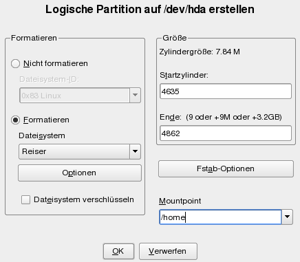 Um ein neues logisches Volume anzulegen, klicken Sie auf und füllen das anschließende Popup-Fenster aus. Wie bei der Partitionierung kann die Größe, das Dateisystem und der Einhängepunkt eingegeben werden. Normalerweise wird in einem logischen Volume ein Dateisystem wie reiserfs oder ext2 erstellt und ein Einhängepunkt wird festgelegt. Die auf diesem logischen Volume gespeicherten Dateien sind dann im installierten System an diesem Einhängepunkt zu finden. Es ist auch möglich, den Datenfluss im logischen Volume über verschiedene physische Volumes zu verteilen (Striping). Wenn sich diese physischen Volumes auf verschiedenen Festplatten befinden, verbessert dies in der Regel die Lese- und Schreibgeschwindigkeit (wie bei RAID 0). Ein Striping-LV mit n Stripes kann jedoch nur richtig angelegt werden, wenn der von dem LV benötigte Festplattenplatz gleichmäßig über n physische Volumes verteilt werden kann. Sind beispielsweise nur zwei physische Volumes verfügbar, ist ein logisches Volume mit drei Stripes nicht möglich.