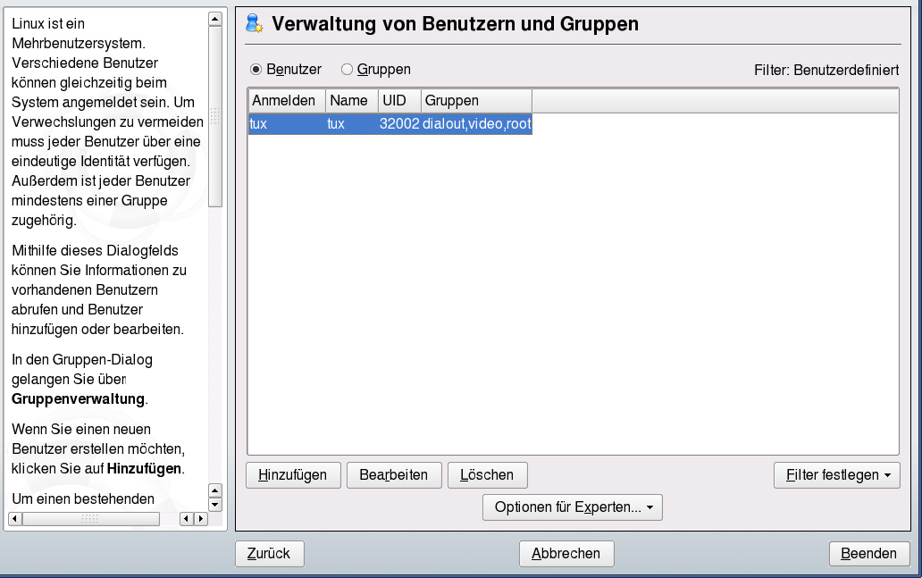Jedem Benutzer wird eine Benutzer-ID (UID) zugewiesen, die den Benutzer im System identifiziert. Neben den Benutzern, die sich an Ihrem Computer anmelden können, gibt es außerdem eine Reihe von Systembenutzern nur für den internen Gebrauch. Jeder Benutzer wird einer oder mehreren Gruppen zugewiesen. Ähnlich wie bei den Systembenutzern gibt es auch Systemgruppen für den internen Gebrauch. Informationen über das Konzept von Benutzern und Gruppen bei Linux finden Sie unter Abschnitt 7.1, Benutzerkonzept.