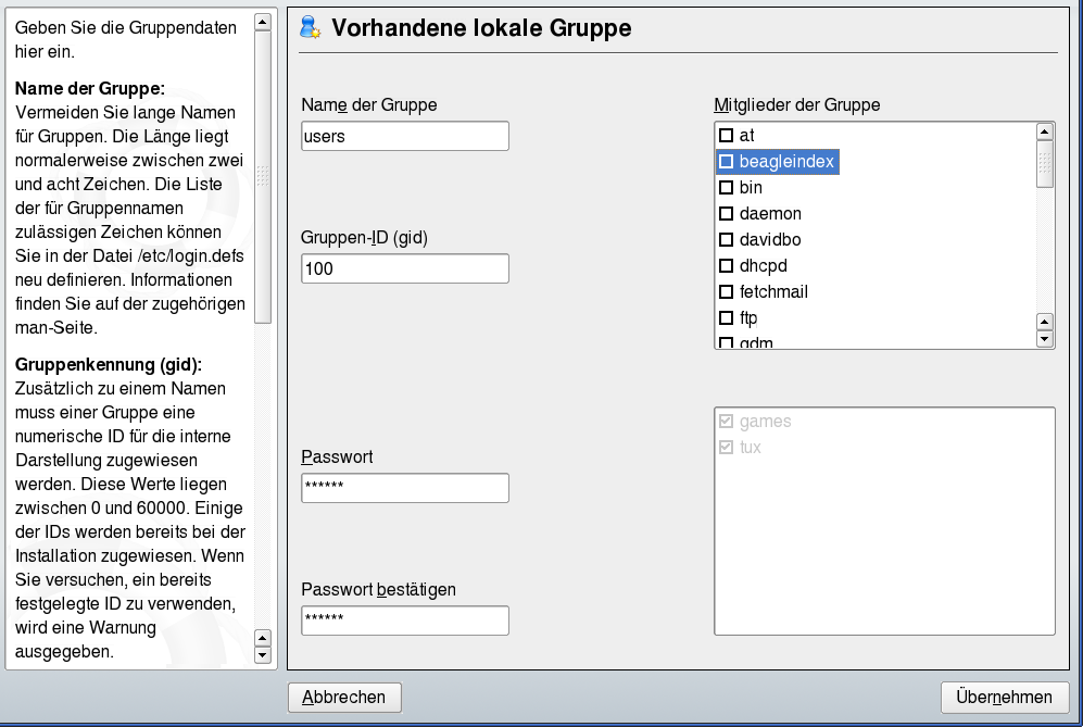 Mit YaST können Sie schnell und einfach Gruppen hinzufügen, bearbeiten und löschen.
