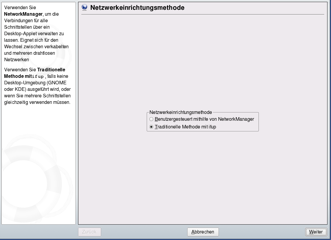 Stellen Sie im ersten Bildschirm die Option auf ein. Zur Deaktivierung des NetworkManagers stellen Sie die Option auf ein.
