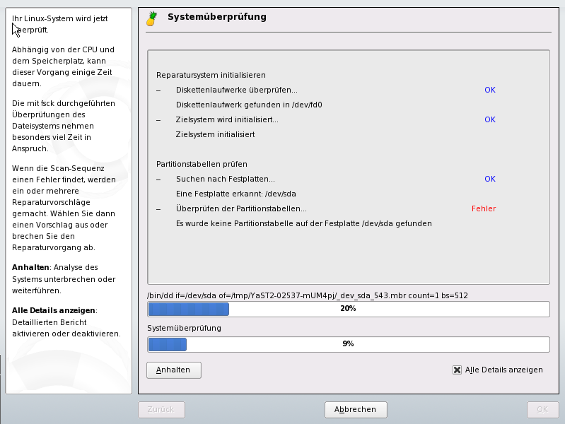 Um die Funktion der YaST-Systemreparatur zu verwenden, fahren Sie wie folgt fort: