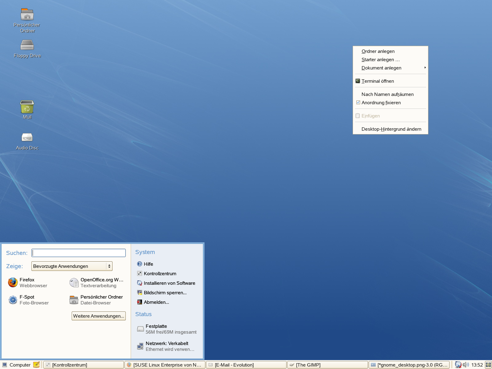 Desktop-Symbole: Greifen Sie auf Programme und Funktionen auf Ihrem System zu, indem Sie darauf doppelklicken. Mit der rechten Maustaste erhalten Sie zusätzliche Menüs und Optionen. Sie können Ihrem Desktop so viele Symbole hinzufügen, wie Sie möchten. Standardmäßig befinden sich auf dem Desktop zwei wichtige Symbole: Ihr persönlicher Home-Ordner und der Papierkorb für gelöschte Elemente. Der Desktop kann jedoch noch weitere Symbole enthalten, die die Geräte Ihres Computers darstellen, beispielsweise ein CD-Laufwerk. Wenn Sie auf Ihren Home-Ordner klicken, wird der Datei-Manager Nautilus gestartet und der Inhalt Ihres Home-Verzeichnisses angezeigt.
