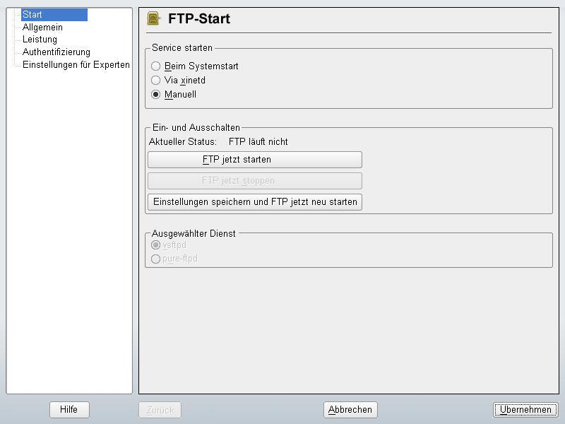 Im Bereich des Dialogfelds wird der verwendete FTP-Server angezeigt. Entweder vsftpd (Very Secure FTP Daemon) oder pure-ftpd können verwendet werden. Wenn beide Server installiert sind, können Sie zwischen ihnen auswählen. Das pure-ftpd-Paket ist in den standardmäßigen openSUSE-Medien nicht enthalten, daher müssen Sie es aus einer anderen Installationsquelle installieren, wenn Sie es verwenden möchten.