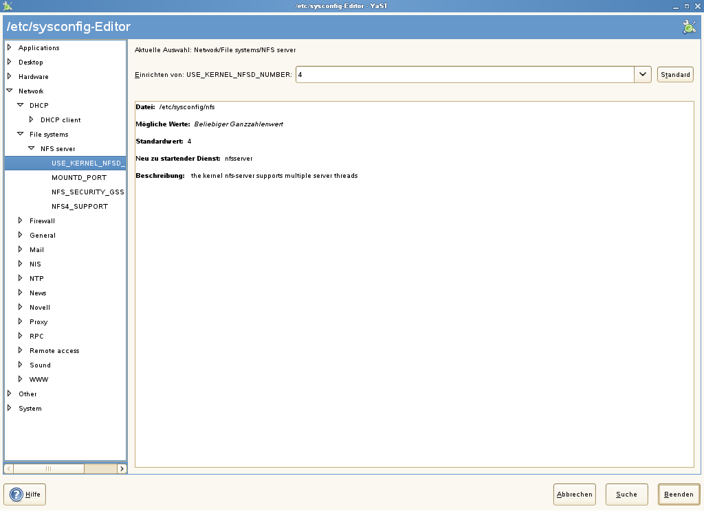 Sie haben zwei Möglichkeiten, die Systemkonfiguration zu bearbeiten. Entweder verwenden Sie den YaST-Editor "sysconfig" oder Sie bearbeiten die Konfigurationsdateien manuell.