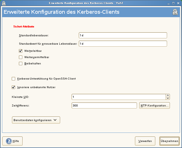 Damit das System mit einem NTP-Server synchronisiert bleibt, können Sie den Host als NTP-Client einrichten, indem Sie wählen. Das unter Abschnitt 24.1, Konfigurieren eines NTP-Client mit YaST beschriebene NTP-Client-Dialogfeld von YaST wird geöffnet. Nach Abschluss der Konfiguration führt YaST alle erforderlichen Änderungen durch und der Kerberos-Client kann verwendet werden.