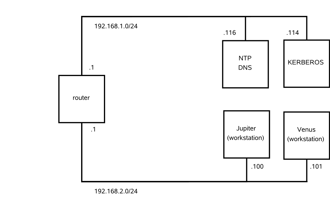 Die folgende Abbildung zeigt ein einfaches Beispielnetzwerk mit den für das Erstellen einer Kerberos-Infrastruktur mindestens erforderlichen Komponenten. Je nach Größe und Topologie Ihrer Bereitstellung müssen Sie möglicherweise ein anderes Setup verwenden.