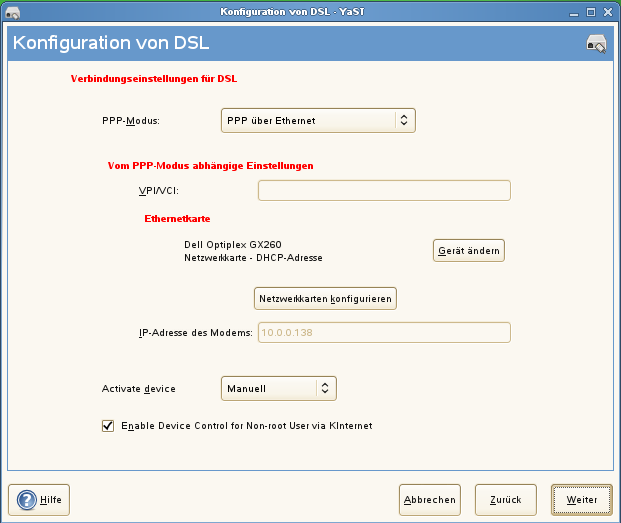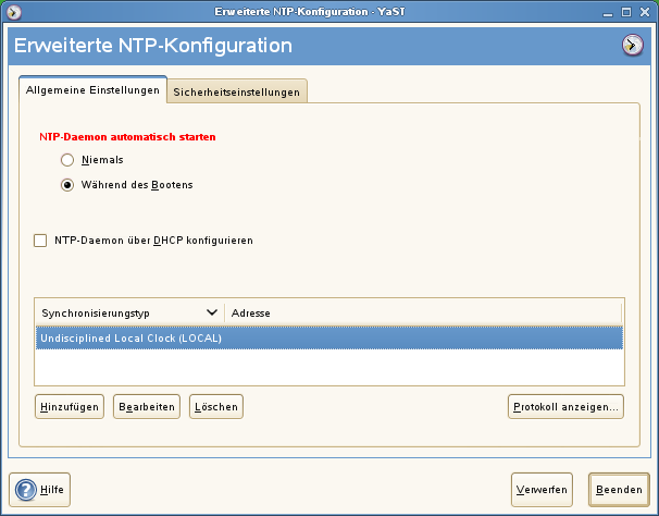 xntp ist so voreingestellt, dass die lokale Computeruhr als Zeitreferenz verwendet wird. Das Verwenden der (BIOS-) Uhr ist jedoch nur eine Ausweichlösung, wenn keine genauere Zeitquelle verfügbar ist. YaST erleichtert die Konfiguration von NTP-Clients. Verwenden Sie für Systeme, die keine Firewall ausführen, entweder die schnelle oder die erweiterte Konfiguration. Bei einem durch eine Firewall geschützten System kann die erweiterte Konfiguration die erforderlichen Ports in SuSEfirewall2 öffnen.