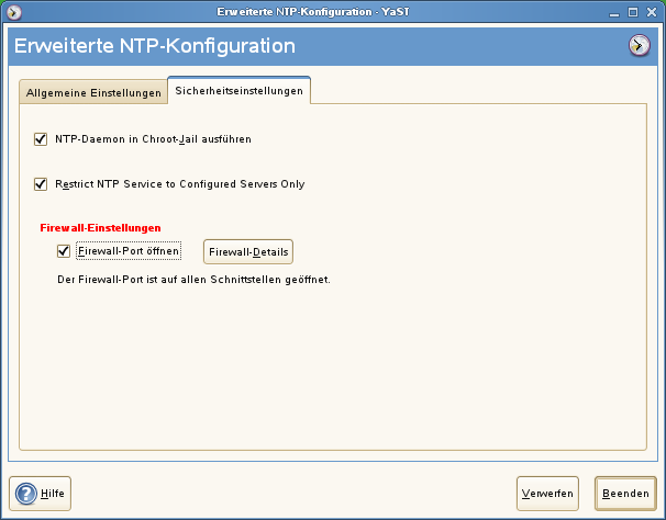 Aktivieren Sie , wenn SuSEfirewall2 aktiviert ist (Standardeinstellung). Wenn Sie den Port geschlossen lassen, können Sie keine Verbindung zum Zeitserver herstellen.