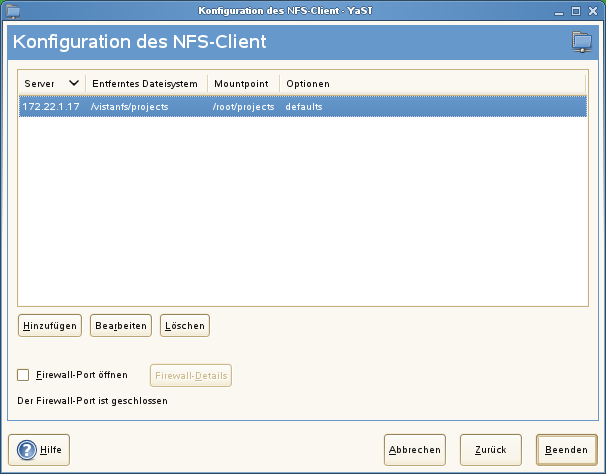 Autorisierte Benutzer können NFS-Verzeichnisse von NFS-Servern in ihre eigenen Dateibäume einhängen. Dies geschieht am einfachsten mit dem YaST-Modul . Geben Sie nur den Hostnamen des NFS-Servers, das zu importierende Verzeichnis und den Einhängepunkt an, an dem das Verzeichnis lokal eingehängt werden soll. Diese Eingaben werden im ersten Dialogfeld nach einem Klick auf eingegeben. Aktivieren Sie , um die Firewall zu öffnen und entfernten Computern den Zugriff auf den Dienst zu gewähren. Der Status der Firewall wird neben dem Kontrollkästchen angezeigt. Klicken Sie auf , um die Änderungen zu speichern. Weitere Informationen hierzu finden Sie in Konfiguration des NFS-Clients mit YaST.