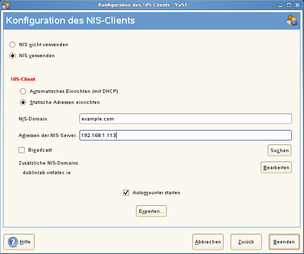 Verwenden Sie das YaST-Modul , um eine Arbeitsstation für den Einsatz von NIS zu konfigurieren. Legen Sie fest, ob der Host eine statische IP-Adresse hat oder ob er eine Adresse vom DHCP-Server erhält. DHCP kann auch die NIS-Domäne und den NIS-Server angeben. Weitere Informationen zu DHCP finden Sie in Abschnitt 23.0, DHCP. Falls eine statische IP-Adresse verwendet wird, geben Sie die NIS-Domäne und den NIS-Server manuell an. Weitere Informationen hierzu finden Sie unter Abbildung 25-6. weist YaST an, in Ihrem gesamten Netzwerk nach einem aktiven NIS-Server zu suchen. Abhängig von der Größe Ihres lokalen Netzwerks kann das ein sehr zeitraubendes Verfahren sein. verlangt einen NIS-Server im lokalen Netzwerk, wenn der angegebene Server nicht reagiert.