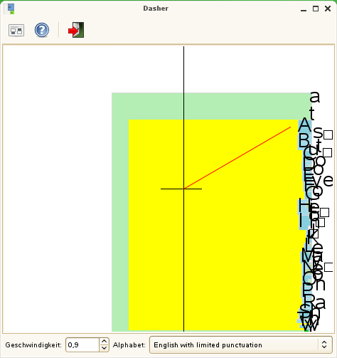 Starten Sie Dasher aus dem Hauptmenü oder über das Shell-Kommando dasher. Sobald Sie den Pen in eine Richtung verschieben, beginnen die Buchstaben auf der rechten Seite vorbeizuzoomen. Aus den Buchstaben, die an dem Fadenkreuz in der Mitte vorbeilaufen, wird der Text erstellt bzw. vorausgesagt und im oberen Teil des Fensters angezeigt. Zum Beenden oder Starten der Texteingabe klicken Sie einmal mit dem Pen auf die Anzeige. Die Zoom-Geschwindigkeit können Sie unten im Fenster einstellen.
