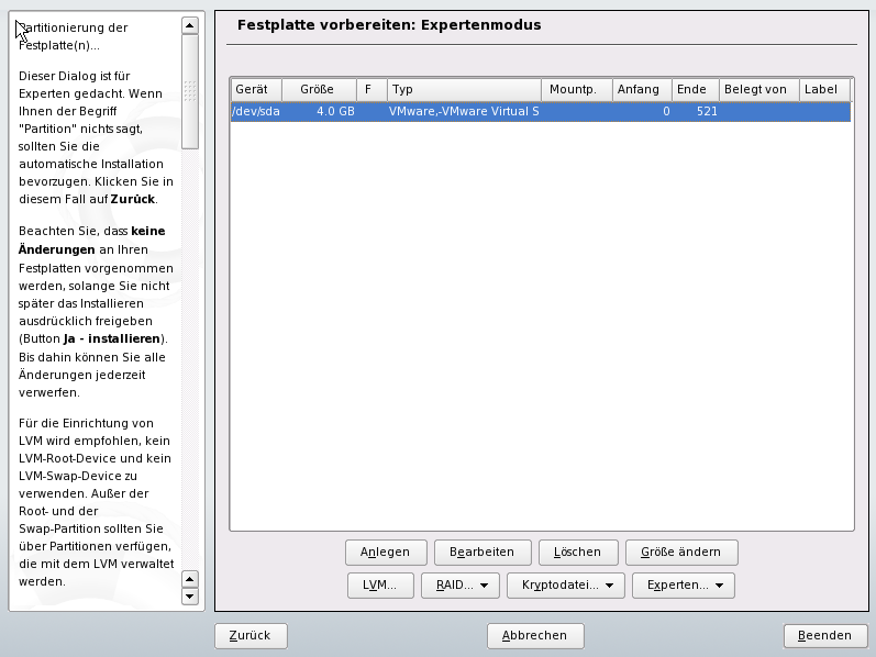 Auch wenn es möglich ist, ein laufendes System neu zu partitionieren, ist das Risiko eines Fehlers mit daraus folgendem Datenverlust sehr hoch. Versuchen Sie daher eine Neupartitionierung des installierten Systems möglichst zu vermeiden. Sollte es sich wirklich nicht umgehen lassen, führen Sie zuvor unbedingt eine vollständige Datensicherung durch.
