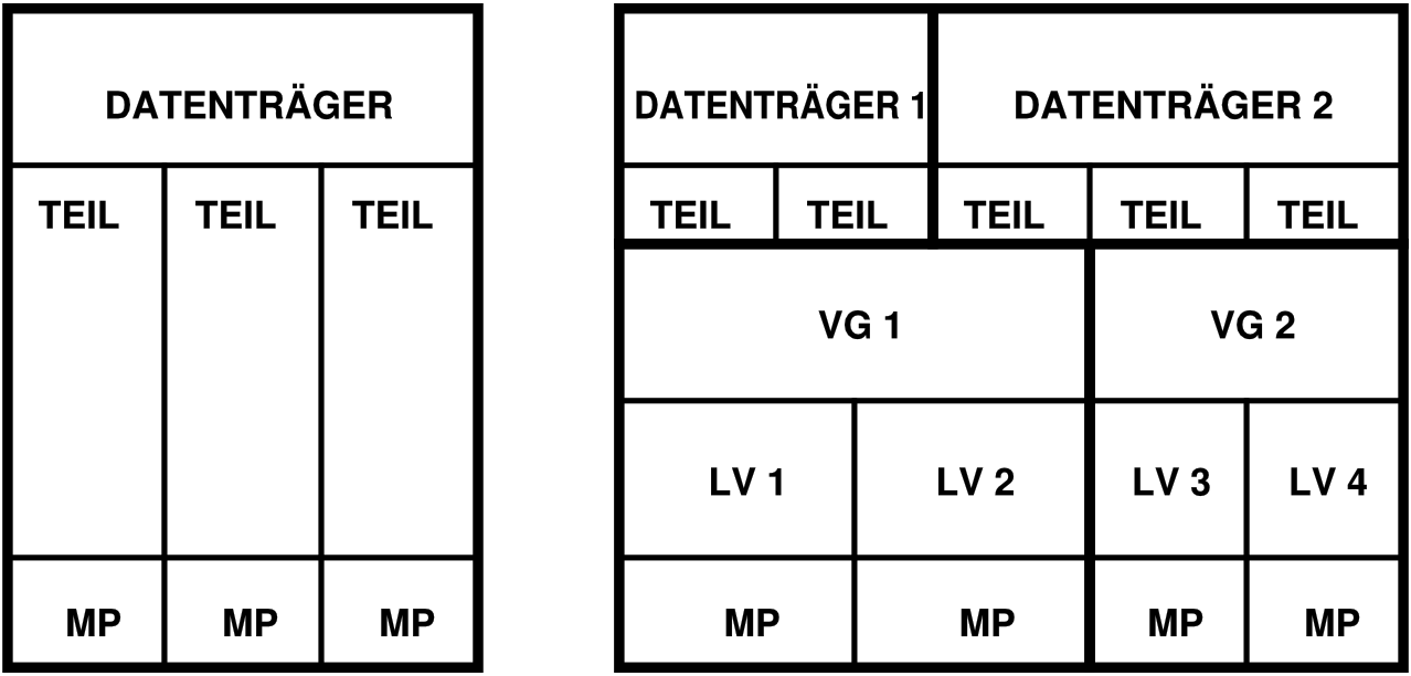 Abbildung 2-2 stellt die physische Partitionierung (links) der LVM-Segmentierung (rechts) gegenüber. Auf der linken Seite wurde eine einzelne Festplatte in drei physische Partitionen (PART) aufgeteilt, von denen jede einen Einhängepunkt (MP) hat, auf den das Betriebssystem zugreifen kann. Auf der rechten Seite wurden zwei Festplatten in zwei bzw. drei physische Partitionen aufgeteilt. Es wurden zwei LVM-Volume-Gruppen (VG 1 und VG 2) angelegt. VG 1 enthält zwei Partitionen von DISK 1 und eine von DISK 2. VG 2 enthält die restlichen zwei Partitionen von DISK 2. In LVM werden die in einer Volume-Gruppe zusammengefassten physischen Festplattenpartitionen als physische Volumes (PVs) bezeichnet. In den Volume-Gruppen wurden vier logische Volumes (LV 1 bis LV 4) angelegt, die vom Betriebssystem über die zugewiesenen Einhängepunkte benutzt werden können. Die Grenzen zwischen verschiedenen logischen Volumes müssen sich nicht mit den Partitionsgrenzen decken. Dies wird in diesem Beispiel durch die Grenze zwischen LV 1 und LV 2 veranschaulicht.