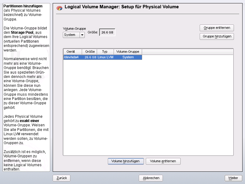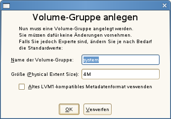 Sobald eine Volume-Gruppe angelegt wurde, listet das folgende Dialogfeld alle Partitionen auf, die entweder den Typ Linux LVM