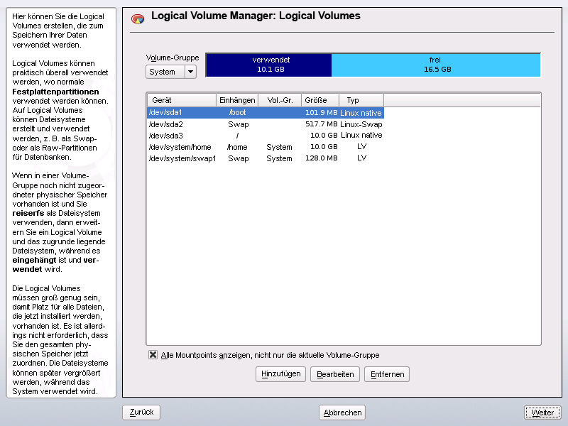 Der Logical Volume Manager (LVM) ermöglicht eine flexible Verteilung von Festplattenspeicher über mehrere Dateisysteme. Er wurde entwickelt, da gelegentlich die Segmentierung des Festplattenspeichers geändert werden muss, nachdem die erste Partitionierung bei der Installation abgeschlossen wurde. Da es schwierig ist, Partitionen in einem laufenden System zu ändern, bietet LVM einen virtuellen Pool (Volume-Gruppe, kurz: VG) an Speicherplatz, aus dem bei Bedarf logische Volumes (LVs) erzeugt werden können. Das Betriebssystem greift dann auf diese logischen Volumes statt auf physische Partitionen zu. Volume-Gruppen können sich über mehr als eine Festplatte erstrecken, wobei mehrere Festplatten oder Teile davon eine einzige VG bilden können. Auf diese Weise bietet LVM eine Art Abstraktion vom physischen Festplattenplatz, der eine viel einfachere und sicherere Möglichkeit zur Änderung der Aufteilung ermöglicht als die physische Umpartitionierung. Hintergrundinformationen zum physischen Partitionieren erhalten Sie in Abschnitt 2.1.1, Partitionstypen und Abschnitt 2.1, Verwenden der YaST-Partitionierung.
