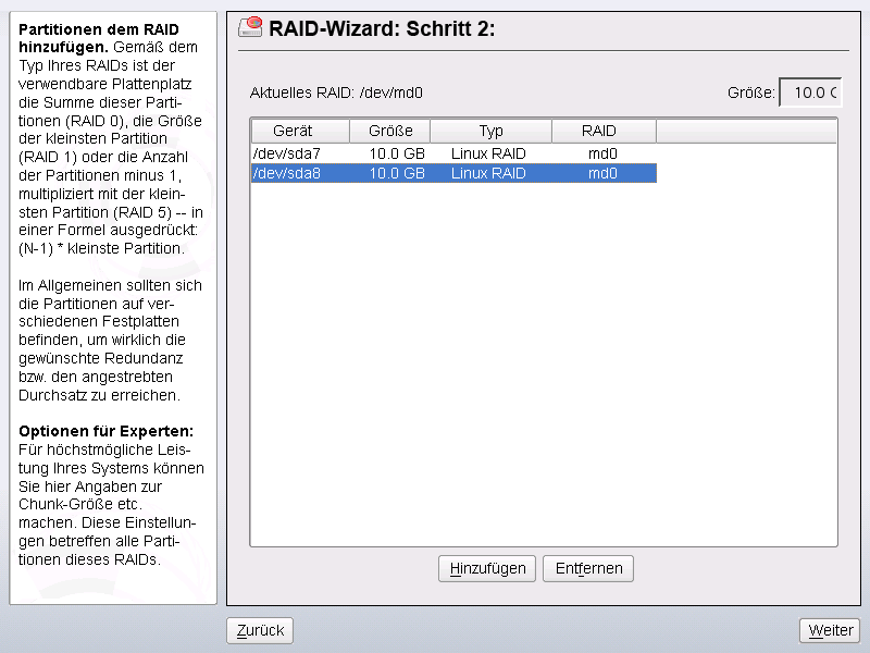 Zur Soft-RAID-Konfiguration gelangen Sie über den YaST-Expertenmodus des Partitionierungsmoduls, der in Abschnitt 2.1, Verwenden der YaST-Partitionierung beschrieben ist. Mit diesem Partitionierungswerkzeug können Sie vorhandene Partitionen bearbeiten und löschen sowie neue Partitionen erstellen, die mit Soft-RAID verwendet werden sollen. Sie erstellen die RAID-Partitionen, indem Sie zunächst auf klicken und anschließend als Partitions-ID wählen. Für RAID 0 und RAID 1 sind mindestens zwei Partitionen erforderlich, für RAID 1 in der Regel exakt zwei. Für RAID 5 sind mindestens drei Partitionen erforderlich. Es wird empfohlen, nur Partitionen gleicher Größe zu verwenden. Die einzelnen Partitionen eines RAIDs sollten auf verschiedenen Festplatten liegen, damit das Risiko eines Datenverlusts durch den Defekt einer Festplatte (RAID 1 und 5) verringert und die Leistung von RAID 0 optimiert wird. Wenn Sie alle gewünschten Partitionen erstellt haben, klicken Sie auf , um die RAID-Konfiguration zu starten.