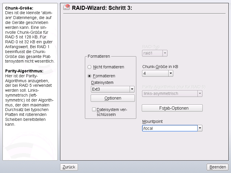 Legen Sie wie bei der konventionellen Partitionierung das zu verwendende Dateisystem sowie die Verschlüsselung und den Einhängepunkt für das RAID-Volume fest. Durch Aktivieren der Option wird gewährleistet, dass die RAID-Partitionen als solche beim Booten erkannt werden. Wenn Sie die Konfiguration mit abgeschlossen haben, sind im Expertenmodus des Partitionierungsmoduls das Gerät /dev/md0 und andere Geräte mit RAID gekennzeichnet.