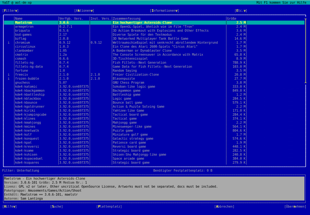 Die F-Tasten (F1 bis F12) bieten schnellen Zugriff auf die verschiedenen Schaltflächen. Welche Funktionstasten welchen Schaltflächen zugeordnet sind, hängt vom aktiven YaST-Modul ab, da die verschiedenen Module unterschiedliche Schaltflächen aufweisen ("Details", "Info", "Hinzufügen", "Löschen" usw.). F10 wird für OK, Weiter und Verlassen verwendet. Mit F1 kann die YaST-Hilfe aufgerufen werden, in der die den einzelnen F-Tasten zugeordneten Funktionen angezeigt werden.