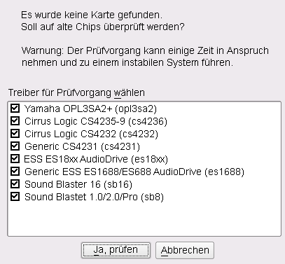 Wenn Sie wissen, dass in Ihrem Computer eine alte Soundkarte installiert ist, lassen Sie &yast nach alten Chips suchen, wenn &yast keine Soundkarte findet. Klicken Sie in der Popup-Meldung auf . Weitere Informationen hierzu finden Sie unter Abbildung 2-1.