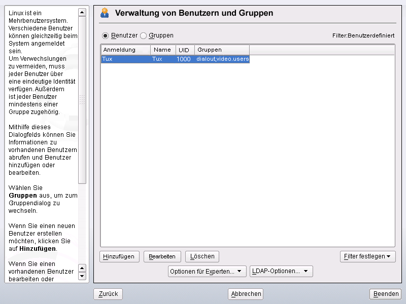 Jedem Benutzer wird eine Benutzer-ID (UID) zugewiesen, die den Benutzer im System identifiziert. Neben den Benutzern, die sich an Ihrem Computer anmelden können, gibt es außerdem eine Reihe von Systembenutzern nur für den internen Gebrauch. Jeder Benutzer wird einer oder mehreren Gruppen zugewiesen. Ähnlich wie bei den Systembenutzern gibt es auch Systemgruppen für den internen Gebrauch. Informationen über das Konzept von Benutzern und Gruppen bei Linux finden Sie unter Abschnitt 7.1, Benutzerkonzept.