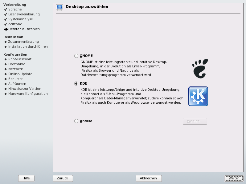 In openSUSE können Sie zwischen unterschiedlichen Desktops wählen. und sind leistungsfähige grafische Desktop-Umgebungen, ähnlich wie Windows*. Weitere Informationen hierzu finden Sie unter KDE User Guide und GNOME User Guide. Dieses Dialogfeld steht bei Installation von CD-KDE oder CD-GNOME nicht zur Verfügung.