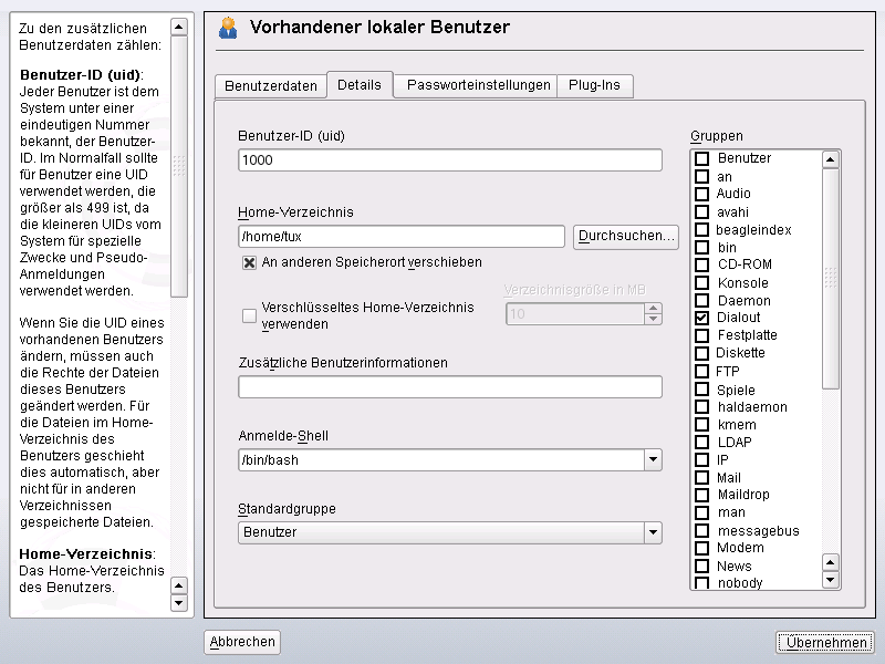 Abbildung 7-1 Gruppenmitgliedschaft für einen Benutzer in YaST