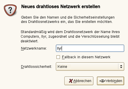 Wenn Ihre drahtlose Netzwerkkarte den Zugriffspunktmodus unterstützt, können Sie NetworkManager für die Konfiguration verwenden. Klicken Sie auf (Neues drahtloses Netzwerk erstellen), um Ihre drahtlose Netzwerkkarte als Zugriffspunkt zu konfigurieren. Weitere Informationen hierzu finden Sie unter Abbildung 10-3. Fügen Sie den Netzwerknamen hinzu und legen Sie unter (Drahtlose Sicherheit) die Verschlüsselung fest.
