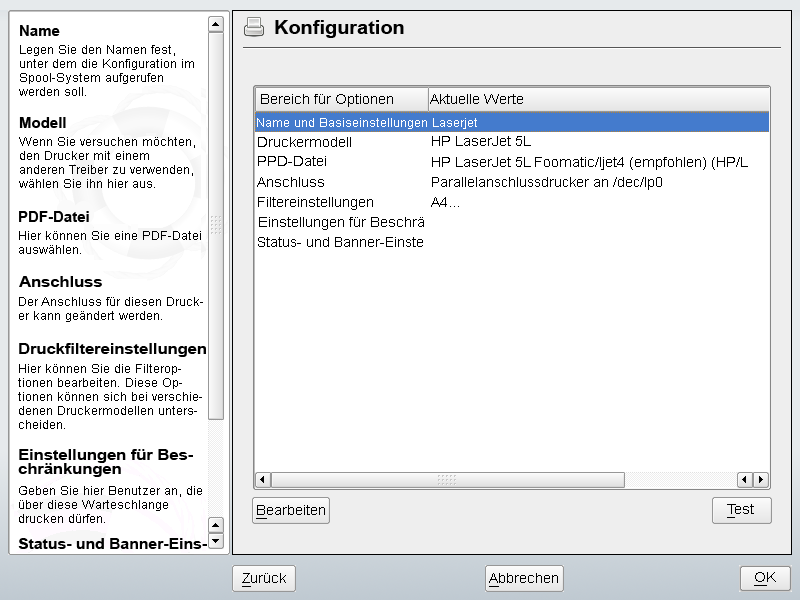 Im Fenster wird eine Zusammenfassung der Druckereinrichtung aufgeführt. Dieses Dialogfeld wird auch angezeigt, wenn Sie eine vorhandene Druckerkonfiguration aus dem Startbildschirm dieses YaST-Moduls ändern.