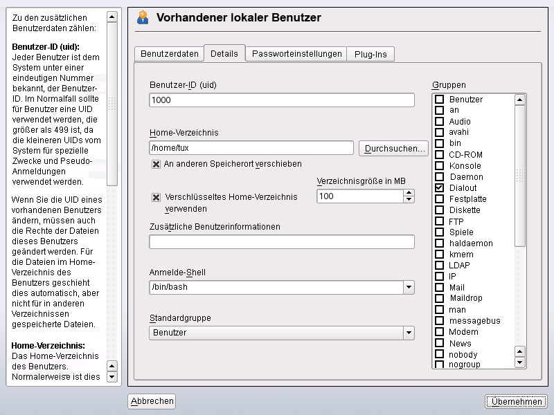 Neben den Einstellungen für ein standardmäßiges Benutzerkonto bietet openSUSE einige spezielle Optionen, beispielsweise die automatische Anmeldung, die Anmeldung ohne Passwort, verschlüsselte Home-Verzeichnisse bzw. Quoten für Benutzer und Gruppen.