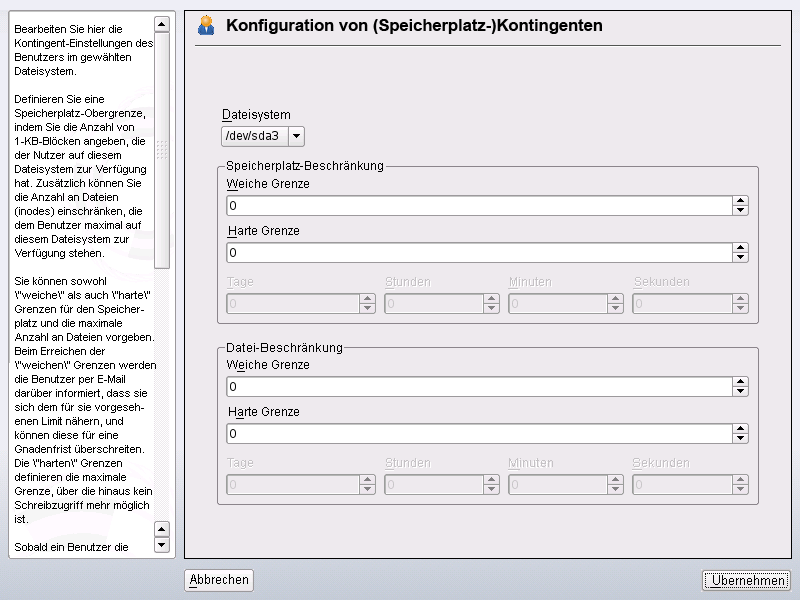 Beschränken Sie im Bereich den Speicherplatz. Geben Sie die Anzahl der 1-KB-Blöcke an, über die der Benutzer bzw. die Gruppe auf dieser Partition verfügen kann. Geben Sie einen Wert für und einen für an.