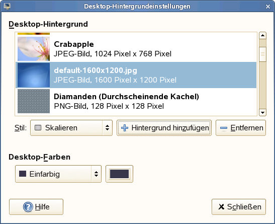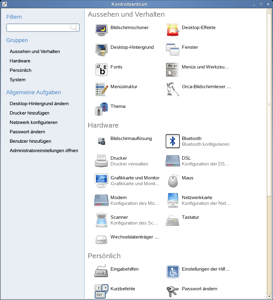 In GNOME können Sie nicht nur individuelle Desktop-Elemente ändern, sondern auch Ihren Desktop ganz nach Ihren persönlichen Vorlieben anpassen. Genauere Einstellungen zum Anpassen des gesamten Aussehens und Verhaltens Ihres Desktops finden Sie im GNOME-Kontrollzentrum. Dort können Sie Schriftarten, Tastatur- und Mauskonfiguration, Länder- und Spracheinstellungen, Parameter für Ihren Internet- und Netzwerkzugang und vieles andere mehr konfigurieren.