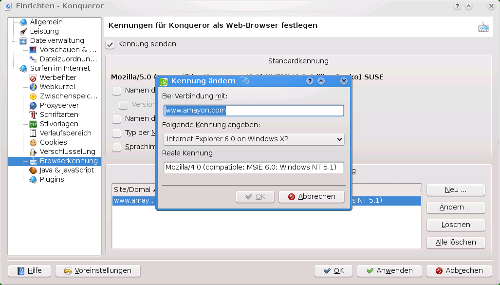 und Konqueror für bestimmte Webseiten, die Sie besuchen, als einen anderen Browser (z. B. Internet Explorer*) identifizieren. Wählen Sie dazu aus und klicken Sie auf , um eine neue, seitenspezifische Identifizierung hinzuzufügen.