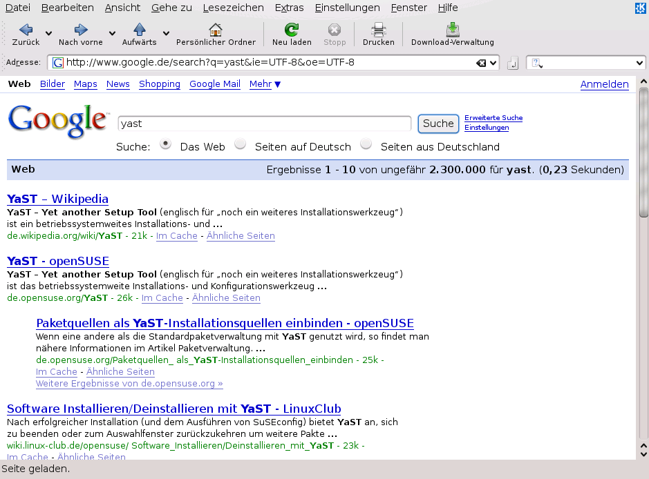 Konqueror bietet Web-Tastenkürzel zur schnellen Suche im Web an. Um im Web mit der Google-Suchmaschine beispielsweise nach yast zu suchen, geben sie einfach gg:yast in der Adressleiste von Konqueror (oder dem Dialogfeld ) ein und drücken Sie Enter.