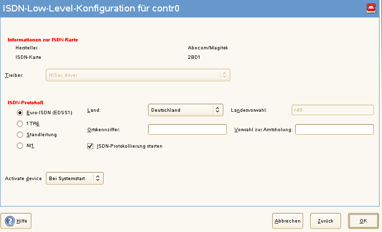 definiert, wie die ISDN-Schnittstelle gestartet werden soll: initialisiert den ISDN-Treiber bei jedem Systemstart. Bei müssen Sie den ISDN-Treiber als root laden. Verwenden Sie hierfür den Befehl rcisdn start. wird für PCMCIA- oder USB-Geräte verwendet. Diese Option lädt den Treiber, nachdem das Gerät eingesteckt wurde. Wenn Sie alle Einstellungen vorgenommen haben, klicken Sie auf .
