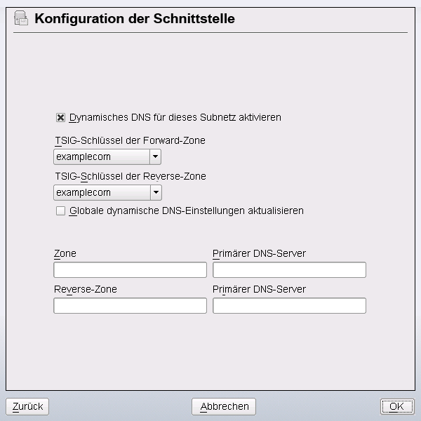 Jetzt können Sie das dynamische DNS für das Subnetz aktivieren, indem Sie wählen. Danach wählen Sie in der Dropdown-Liste die TSIG-Schlüssel für Forward und Reverse Zones. Vergewissern Sie sich dabei, dass die Schlüssel für den DNS- und den DHCP-Server dieselben sind. Mit der Option aktivieren Sie die automatische Aktualisierung und Einstellung der globalen DHCP-Servereinstellungen entsprechend der dynamischen DNS-Umgebung. Nun legen Sie fest, welche Forward und Reverse Zones über das dynamische DNS aktualisiert werden sollen. Dafür geben Sie den primären Namenserver für beide Zonen an. Wenn der Namenserver auf demselben Host wie der DHCP-Server ausgeführt wird, können Sie diese Felder leer lassen. Wenn Sie wählen, gelangen Sie wieder zum Dialogfeld für die Subnetzkonfiguration (siehe Abbildung 17-8). Wenn Sie noch einmal auf klicken, gelangen Sie wieder zum ursprünglichen Dialogfeld für die Expertenkonfiguration.