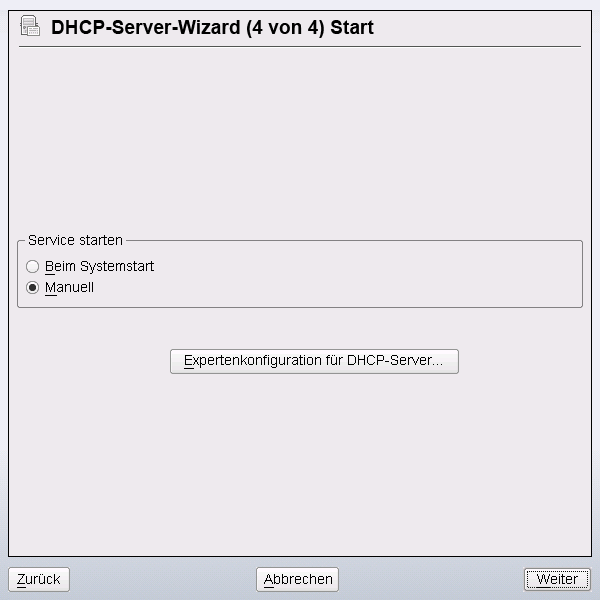 Nachdem Sie den dritten Teil des Konfigurationsassistenten abgeschlossen haben, gelangen Sie in ein letztes Dialogfeld, das sich mit den Startoptionen des DHCP-Servers befasst. Hier können Sie festlegen, ob der DHCP-Server automatisch beim Booten des Systems oder bei Bedarf (z. B. zu Testzwecken) manuell gestartet werden soll. Klicken Sie auf , um die Konfiguration des Servers abzuschließen. Weitere Informationen hierzu finden Sie unter Abbildung 17-4. Alternativ können Sie links aus der Baumstruktur auswählen, um zusätzlich zur grundlegenden Konfiguration bestimmte Host-Verwaltungsfunktionen zu konfigurieren (siehe Abbildung 17-5).