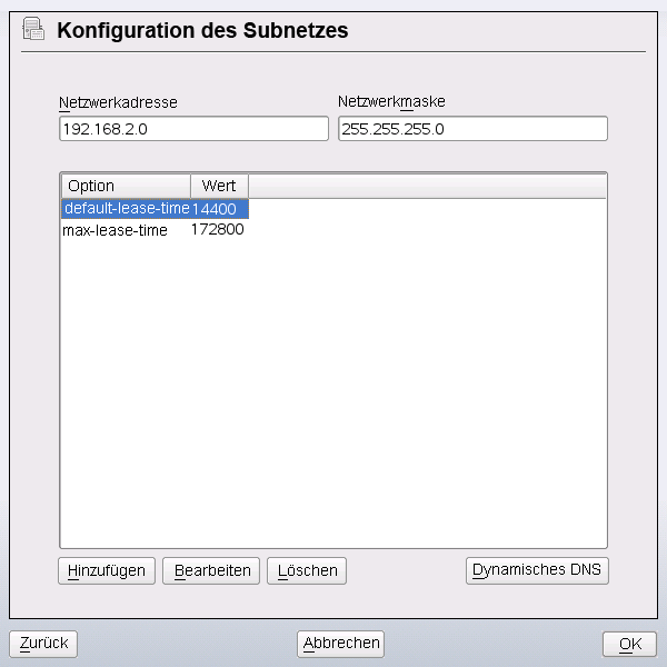 In diesem Dialogfeld können Sie ein neues Subnetz mit seiner IP-Adresse und Netzmaske angeben. In der Mitte des Dialogfelds ändern Sie die Startoptionen des DHCP-Servers für das ausgewählte Subnetz mit den Optionen , und . Um einen dynamischen DNS für das Subnetz einzurichten, wählen Sie .
