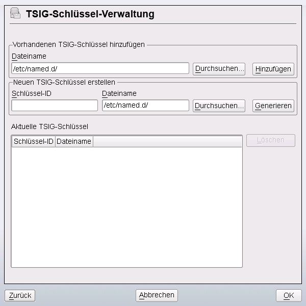 Wenn Sie im vorigen Dialogfeld die Konfiguration des dynamischen DNS vorgenommen haben, können Sie jetzt die Schlüsselverwaltung für einen sicheren Zonentransfer konfigurieren. Wenn Sie wählen, gelangen Sie zu einem weiteren Dialogfeld, in dem Sie die Schnittstelle für das dynamische DNS konfigurieren können (siehe Abbildung 17-10).