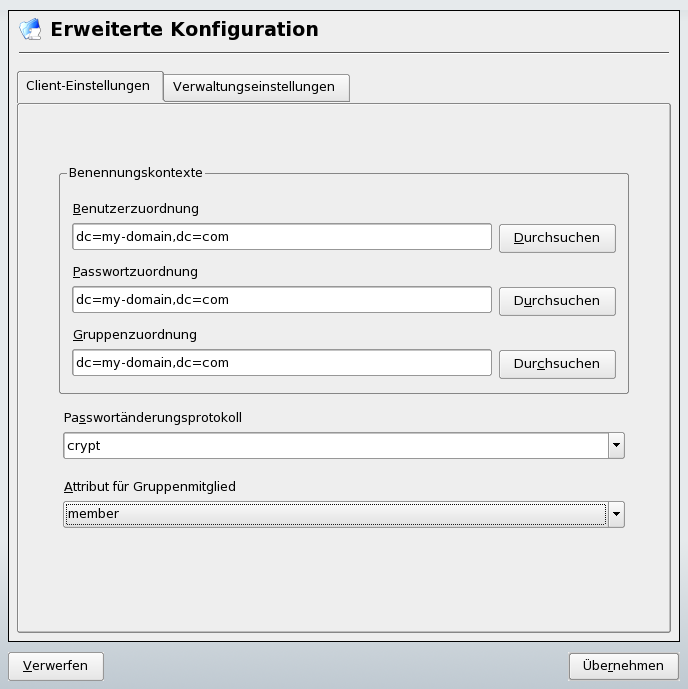 Verwenden Sie für die weitere Konfiguration der YaST-Gruppe und der Benutzerkonfigurationsmodule den YaST-LDAP-Client. Dies beinhaltet die Änderung der Standardeinstellungen für neue Benutzer und Gruppen und der Anzahl und Art von Attributen, die einem Benutzer bzw. einer Gruppe zugewiesen sind. Mit der LDAP-Benutzerverwaltung können Sie Benutzern und Gruppen mehrere und verschiedene Attribute zuweisen als bei herkömmlichen Lösungen zur Gruppen- oder Benutzerverwaltung. Die Konfiguration eines solchen Servers wird in Abschnitt 20.4.2, Konfigurieren der YaST-Gruppe und der Benutzerverwaltungsmodule beschrieben.