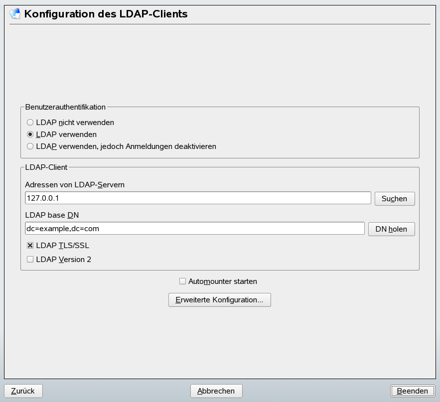 YaST enthält ein Modul zum Einrichten der LDAP-basierten Benutzerverwaltung. Wenn Sie diese Funktion bei der Installation nicht aktiviert haben, starten Sie das Modul, indem Sie wählen. YaST aktiviert alle PAM- und NSS-bezogenen Änderungen, die für LDAP erforderlich sind, und installiert die benötigten Dateien. Verbinden Sie einfach Client und Server miteinander und lassen Sie YaST Benutzer über LDAP verwalten. Das grundlegende Setup wird in Abschnitt 20.4.1, Konfigurieren der grundlegenden Einstellungen beschrieben.