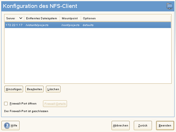 Autorisierte Benutzer können NFS-Verzeichnisse von NFS-Servern in ihre eigenen Dateibäume einhängen. Dies geschieht mit dem YaST-Modul . Geben Sie nur den Hostnamen des NFS-Servers, das zu importierende Verzeichnis und den Einhängepunkt an, an dem das Verzeichnis lokal eingehängt werden soll. Die Änderungen werden wirksam, nachdem im ersten Dialogfeld auf geklickt wird. Klicken Sie auf , um die Firewall zu öffnen und entfernten Computern den Zugriff auf den Dienst zu gewähren. Der Status der Firewall wird neben dem Kontrollkästchen angezeigt. Klicken Sie auf , um die Änderungen zu speichern. Weitere Informationen hierzu finden Sie in Konfiguration des NFS-Clients mit YaST.
