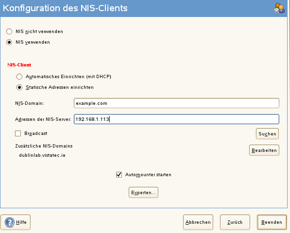 Verwenden Sie das YaST-Modul , um eine Arbeitsstation für den Einsatz von NIS zu konfigurieren. Legen Sie fest, ob der Host eine statische IP-Adresse hat oder ob er eine Adresse vom DHCP-Server erhält. DHCP kann auch die NIS-Domäne und den NIS-Server angeben. Weitere Informationen zu DHCP finden Sie in Abschnitt 17.0, DHCP. Falls eine statische IP-Adresse verwendet wird, geben Sie die NIS-Domäne und den NIS-Server manuell an. Weitere Informationen hierzu finden Sie unter Abbildung 19-6. weist YaST an, in Ihrem gesamten Netzwerk nach einem aktiven NIS-Server zu suchen. Abhängig von der Größe Ihres lokalen Netzwerks kann das ein sehr zeitraubendes Verfahren sein. verlangt einen NIS-Server im lokalen Netzwerk, wenn der angegebene Server nicht reagiert.