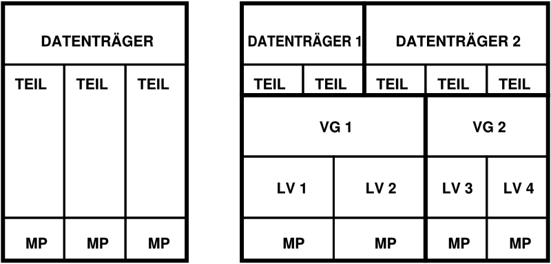 Abbildung 2-2 stellt die physische Partitionierung (links) der LVM-Segmentierung (rechts) gegenüber. Auf der linken Seite wurde eine einzelne Festplatte in drei physische Partitionen (PART) aufgeteilt, von denen jede einen Einhängepunkt (MP) hat, auf den das Betriebssystem zugreifen kann. Auf der rechten Seite wurden zwei Festplatten in zwei bzw. drei physische Partitionen aufgeteilt. Es wurden zwei LVM-Volume-Gruppen (VG 1 und VG 2) angelegt. VG 1 enthält zwei Partitionen von DISK 1 und eine von DISK 2. VG 2 enthält die restlichen zwei Partitionen von DISK 2. In LVM werden die in einer Volume-Gruppe zusammengefassten physischen Festplattenpartitionen als physische Volumes (PVs) bezeichnet. In den Volume-Gruppen wurden vier logische Volumes (LV 1 bis LV 4) angelegt, die vom Betriebssystem über die zugewiesenen Einhängepunkte benutzt werden können. Die Grenzen zwischen verschiedenen logischen Volumes müssen sich nicht mit den Partitionsgrenzen decken. Dies wird in diesem Beispiel durch die Grenze zwischen LV 1 und LV 2 veranschaulicht.