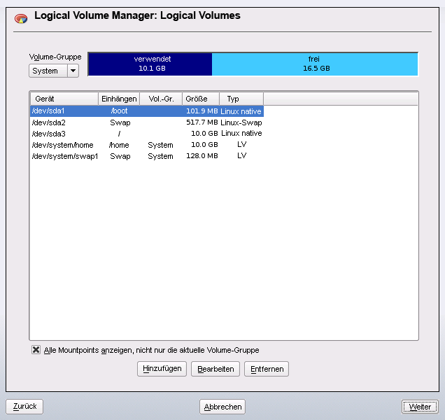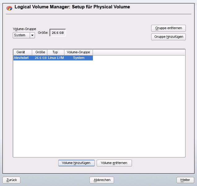 Sobald eine Volume-Gruppe angelegt wurde, listet das folgende Dialogfeld alle Partitionen auf, die entweder den Typ Linux LVM