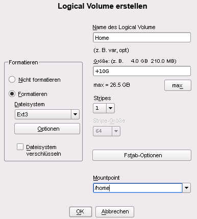 Um ein neues logisches Volume anzulegen, klicken Sie auf und füllen das anschließende Popup-Fenster aus. Wie bei der Partitionierung kann die Größe, das Dateisystem und der Einhängepunkt eingegeben werden. Normalerweise wird in einem logischen Volume ein Dateisystem wie reiserfs oder ext2 erstellt und ein Einhängepunkt wird festgelegt. Die auf diesem logischen Volume gespeicherten Dateien sind dann im installierten System an diesem Einhängepunkt zu finden. Es ist auch möglich, den Datenfluss im logischen Volume über verschiedene physische Volumes zu verteilen (Striping). Wenn sich diese physischen Volumes auf verschiedenen Festplatten befinden, verbessert dies in der Regel die Lese- und Schreibgeschwindigkeit (wie bei RAID 0). Ein Striping-LV mit n Stripes kann jedoch nur richtig angelegt werden, wenn der von dem LV benötigte Festplattenplatz gleichmäßig über n physische Volumes verteilt werden kann. Sind beispielsweise nur zwei physische Volumes verfügbar, ist ein logisches Volume mit drei Stripes nicht möglich.