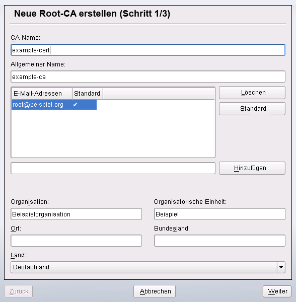Geben Sie die Grunddaten für die Zertifizierungsstelle im ersten in Abbildung 30-1 gezeigten Dialogfeld ein. Die Textfelder haben folgende Bedeutungen: