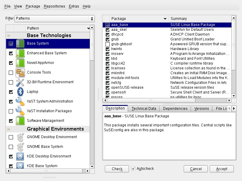 Alternativ können Sie nach Paketgruppen filtern. Die Funktion für Paketgruppen bietet eine detailliertere Ansicht der Software mit einer Gruppierung nach Kategorien. Häufig sind Pakete von anderen Paketen abhängig. Wenn Sie ein Paket auswählen, werden Sie möglicherweise aufgefordert, weitere Pakete zu installieren, um mögliche Paketabhängigkeiten aufzulösen.