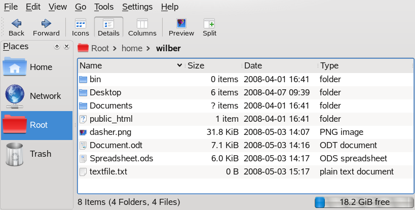 Anders als in Windows können Dateien in Linux eine Dateinamenserweiterung wie .txt aufweisen, müssen jedoch nicht. Für Neulinge ist es am Anfang der Arbeit in einer Shell manchmal schwierig, zwischen Dateien und Ordnern zu unterscheiden, je nachdem, welchen Befehl sie zum Auflisten eines Verzeichnisinhalts verwenden. Weitere Informationen über einige grundlegende Shell-Befehle erhalten Sie unter Abschnitt 8.0, Shell-Grundlagen. Wenn Sie die grafischen Dateimanager in KDE oder GNOME, verwenden, werden Dateien und Ordner abhängig von der gewählten Ansicht durch verschiedene Symbole dargestellt.