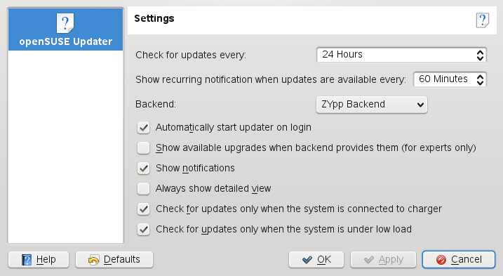 Standardmäßig wird openSUSE Updater bei der Anmeldung gestartet, prüft alle 24 Stunden auf Updates, zeigt alle 60 Minuten Benachrichtigungen an und überwacht lediglich die Verfügbarkeit von Patches. Um dieses Verhalten zu ändern, klicken Sie mit der rechten Maustaste auf das Applet-Symbol und wählen Sie die Option .
