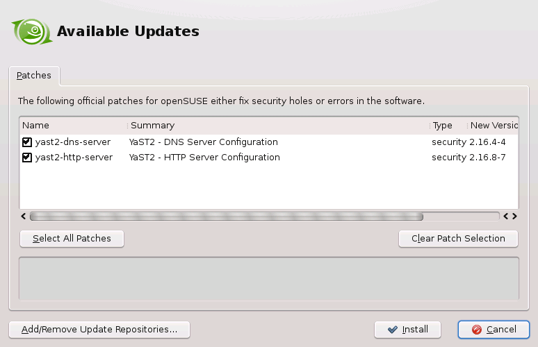 Mit den von openSUSE bereitgestellten Patches werden entweder Sicherheitslücken oder schwer wiegende Fehler in der Software beseitigt. Mit einem Patch erfolgt in der Regel keine Aufrüstung auf eine neuere Version und es werden keine zusätzlichen Funktionen zur Verfügung gestellt. Eine von der Community zur Verfügung gestellte neue Programmversion enthält möglicherweise auch Fixes, dient jedoch hauptsächlich der Bereitstellung neuer Funktionen.
